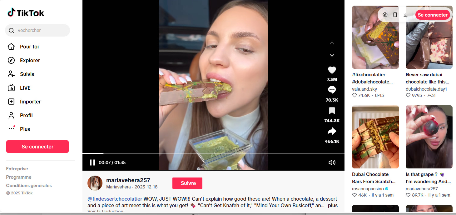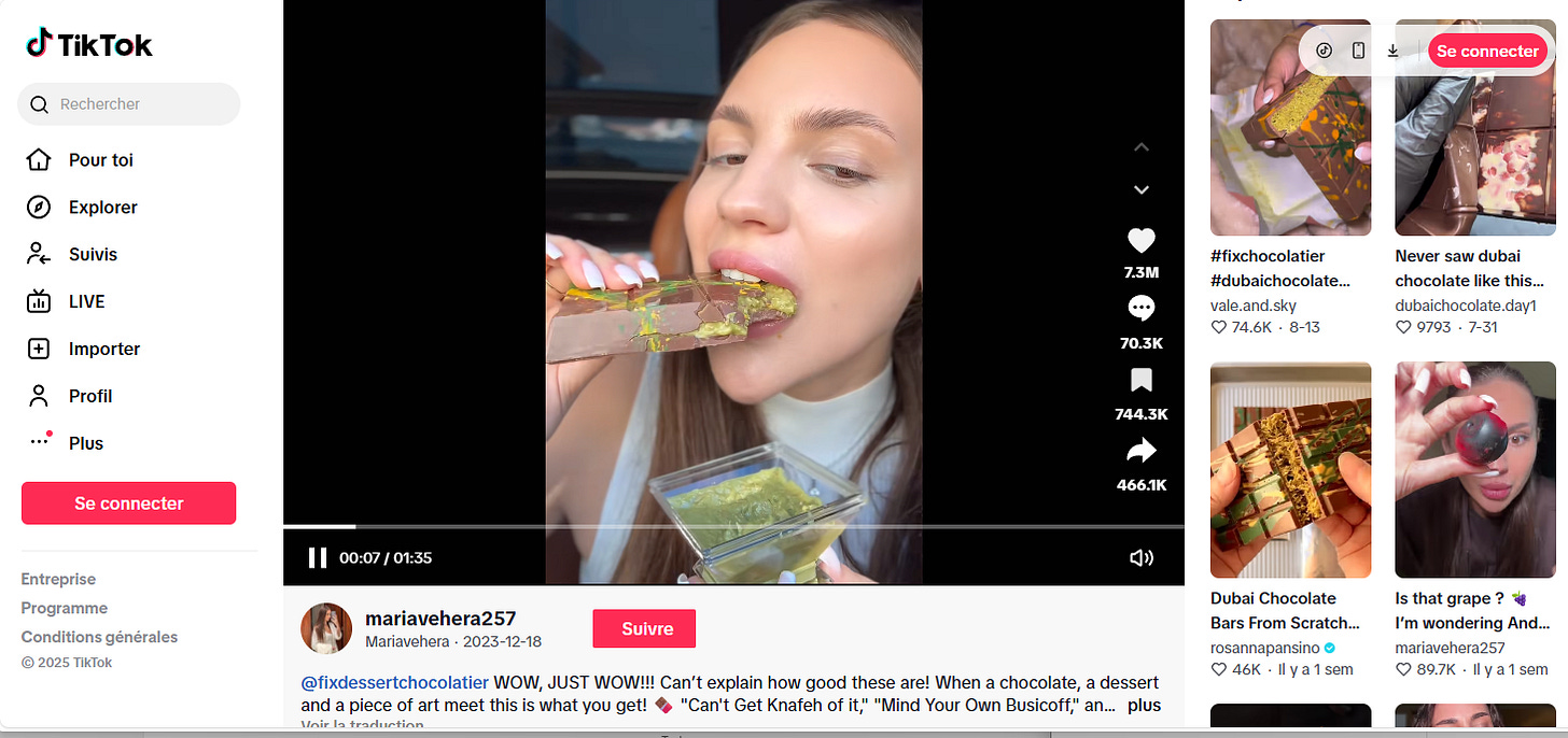 Une influenceuse se filme en train de manger du chocolat de Dubaï dans sa voiture (deux ans après le lancement de la barre de chocolat), puis quelqu’un d’autre le fait avec la même musique, puis quelqu'un se filme en train de regarder ces vidéos, et ainsi de suite. Quelques mois plus tard, ces friandises à la pistache sont en vente chez Jean Coutu.